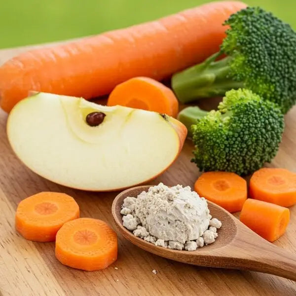 Jabolčna pulpa in pivski kvas z vitamini B ter prebiotiki krepijo črevesno mikrofloro in imunost. Vlaknine iz zelenjave spodbujajo zdravo prebavo, trdne iztrebke in zmanjšujejo tveganje za pojav driske.