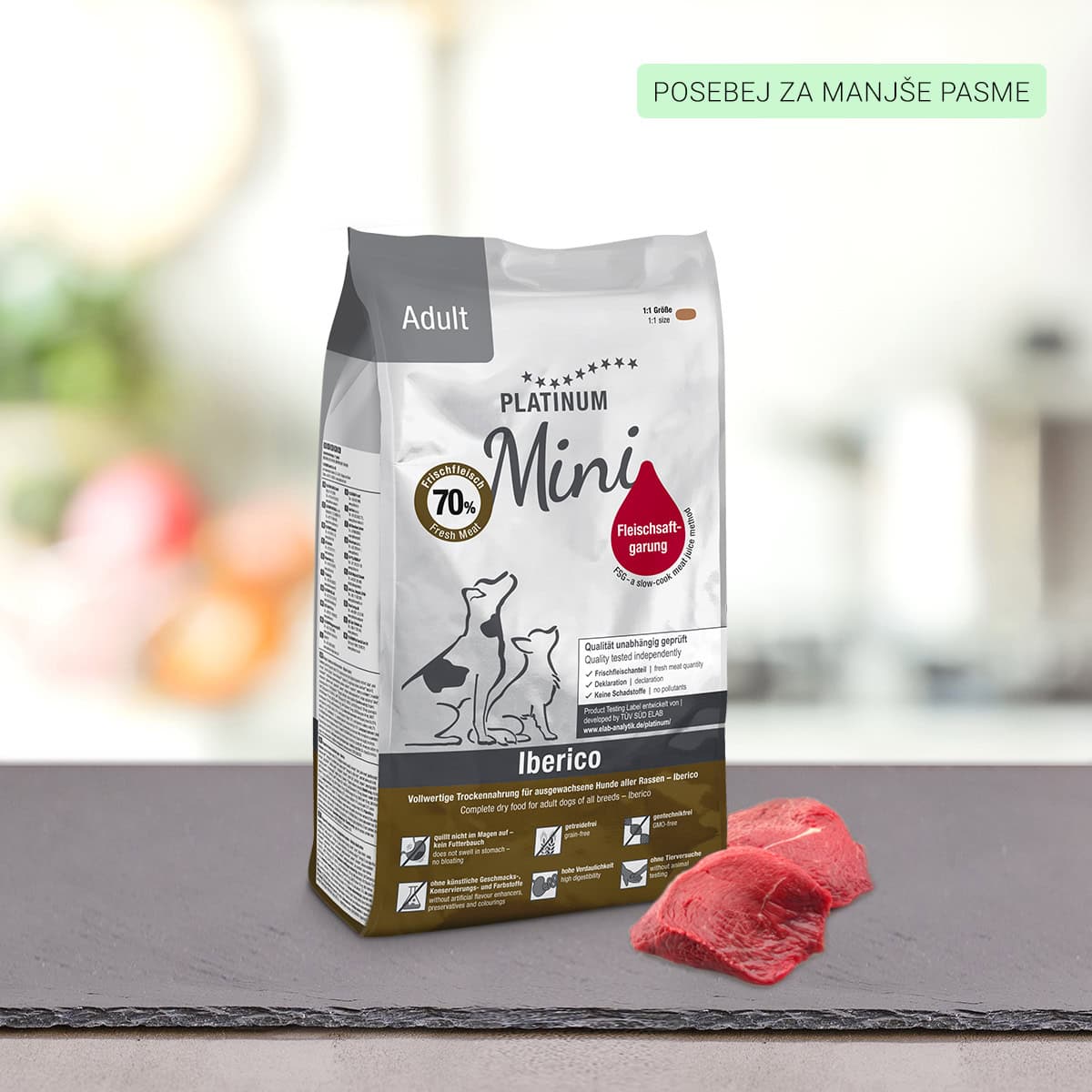 Naši mini koščki suhe hrane za pse PLATINUM so veliki približno 10 mm, zato so popolni za manjše pse, ki tehtajo do 10 kg.