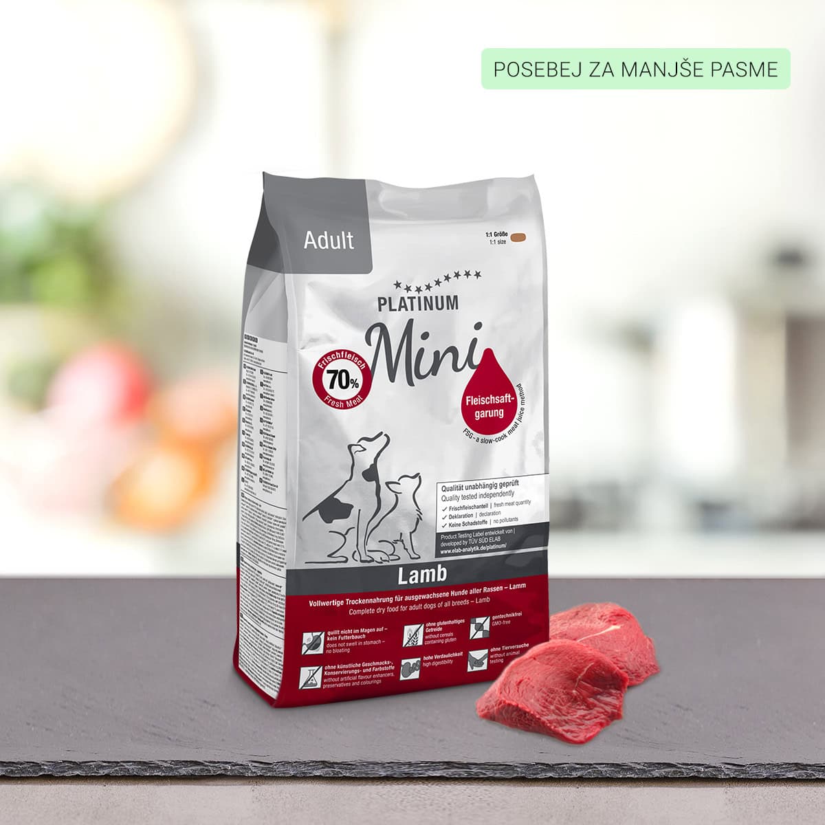 Naši mini koščki suhe hrane za pse PLATINUM so veliki približno 10 mm, zato so popolni za manjše pse, ki tehtajo do 10 kg.