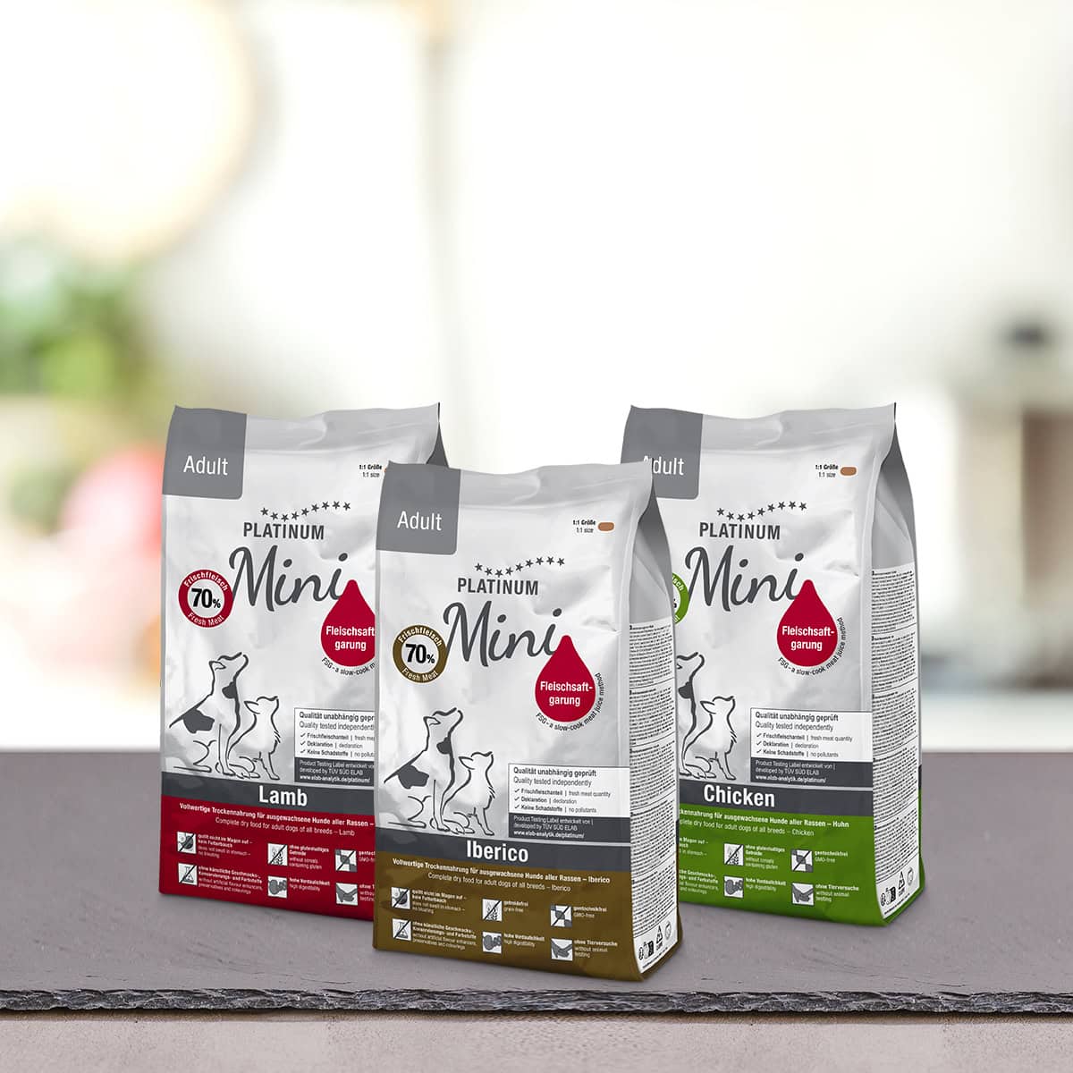 Nalaganje slike: Na pultu so ena poleg druge postavljene tri vrečke PLATINUM Paket različnih okusov Mini Suhe Hrane za Pse, vsaka v pisani embalaži. Ozadje je zamegljeno, kar poudarja vrhunsko blagovno znamko.