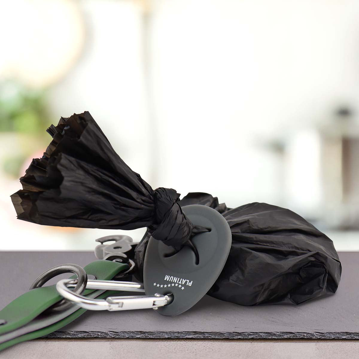 Nalaganje slike: Črn oval Nosilec vrečk za iztrebke by PLATINUM s kovinsko sponko leži na sivi površini, na kateri so napis "PLATINUM" in zvezde v beli barvi. Zamegljeno kuhinjsko ozadje namiguje, da je idealno za sprehod s psom.