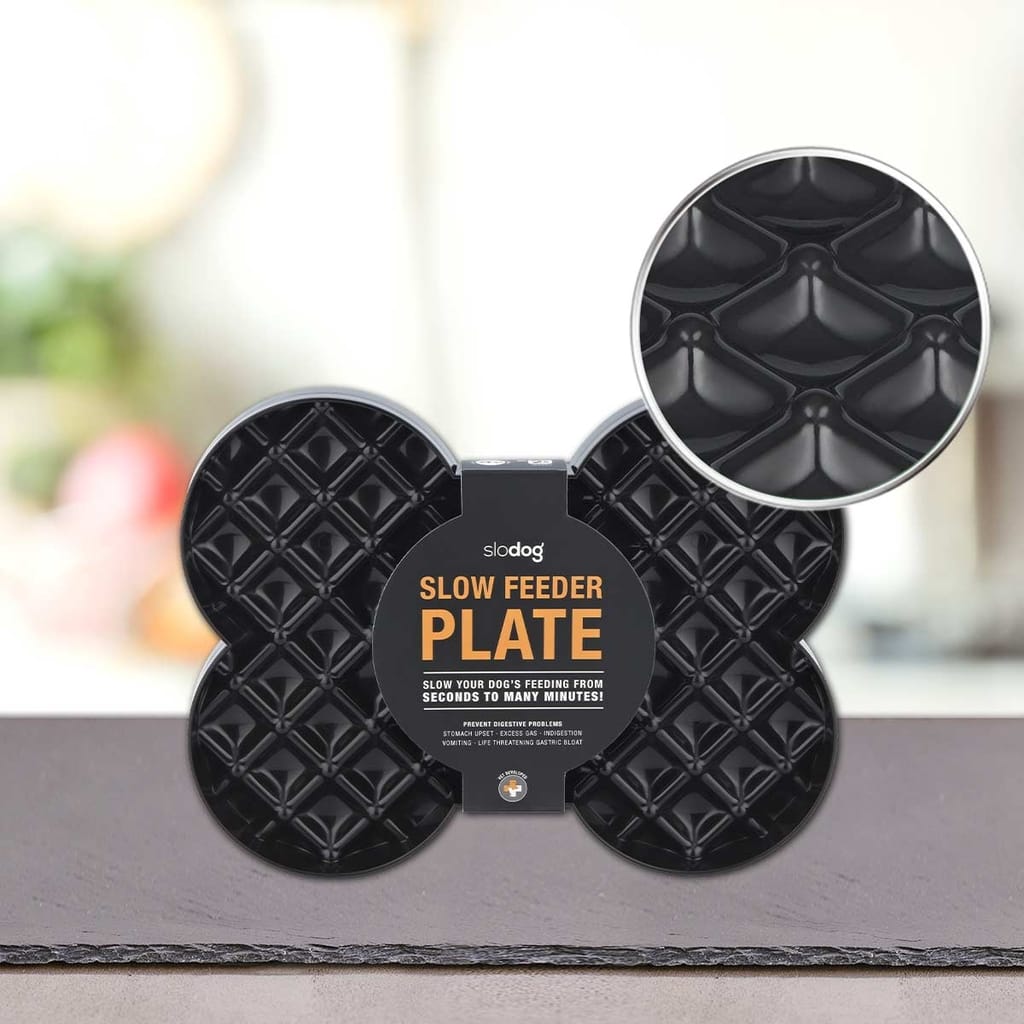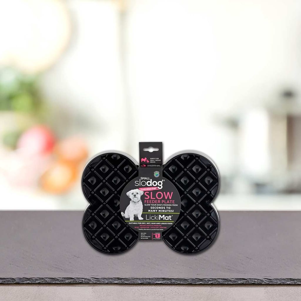 LickiMat SloDog je najbolj počasen hranilnik na trgu in je idealen za pse, ki jedo prehitro. Večina počasnih hranilnikov deluje tako, da postavi ovire ali strukture, podobne labirintu, da pes težko pride do hrane, kar je lahko za psa izjemno frustrirajoče. SloDog je edinstven pristop k počasnemu hranjenju ali proti požiranju. S prehodom iz sklede na krožnik je psu, ki se hrani, na voljo veliko večja površina. Vsa hrana je na vidnem mestu in je ni treba loviti, da se izogneš frustracijam. S svojo edinstveno zasnovo je SloDog zasnovan posebej za sproščen čas hranjenja brez stresa. Testiranje je pokazalo, da lahko SloDog upočasni hranjenje od nekaj sekund pa do veliko minut!