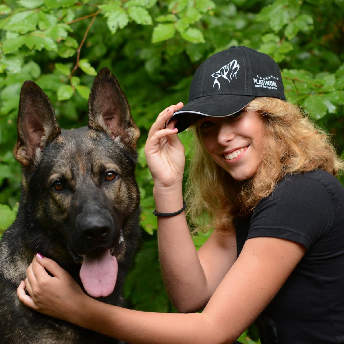 Nalaganje slike: Nasmejana oseba z valovitimi svetlimi lasmi nosi kapo Ekskluzivna PLATINUM kapa s šiltom-tvoja nagrada za zvestobo!-izdelek PLATINUM z grafiko volka in besedilom, ki stoji na prostem med zelenim listjem.