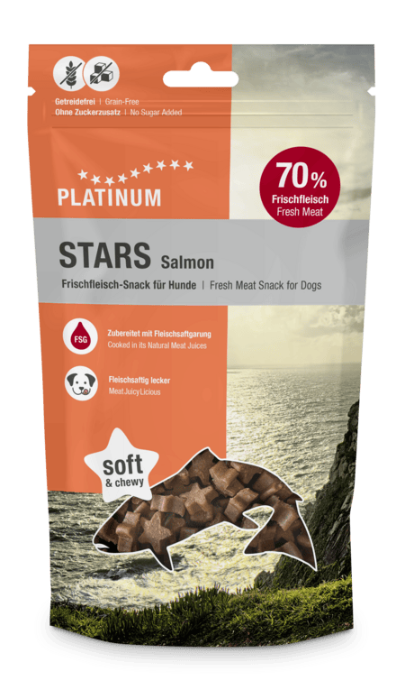 Najboljša nagrada za tvojega psa – PLATINUM Stars Salmon so mehki, sveži koščki lososa, pripravljeni z edinstveno FSG metodo, ki ohrani mesni sok in okus. Idealni so za trening, nagrado ali razvajanje – vsak grižljaj navduši!