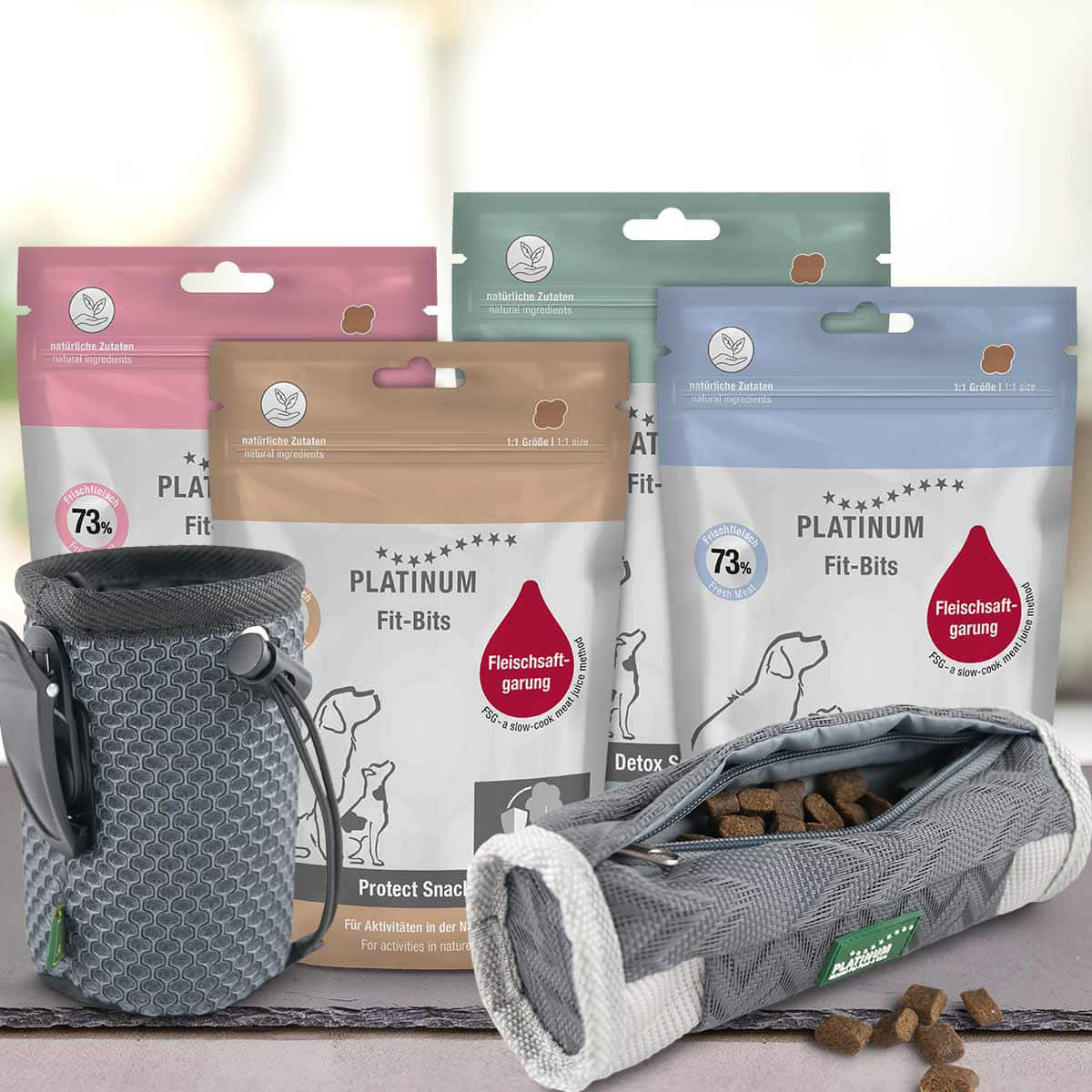 Nalaganje slike: Za dvema sivima vrečkama za priboljške PLATINUM Paket okusov Priboljškov za Pse so nameščene štiri pisane vrečke s pasjimi priboljški; na embalaži so ilustracije psov in etikete v nemščini.